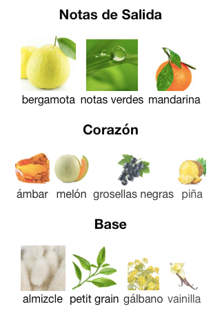 Acordes dominantes: cítrico, afrutado, ámbar, limpio / jabón, notas verdes
