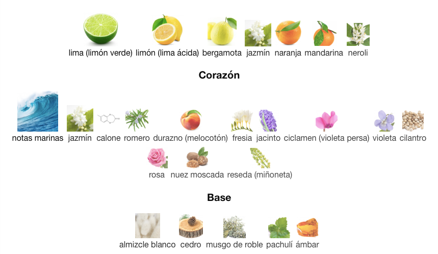 Corazón: notas marinas, jazmín, calone, romero, durazno (melocotón), fresia, jacinto, ciclamen (violeta persa), violeta, cilantro, rosa, nuez moscada, reseda (miñoneta)