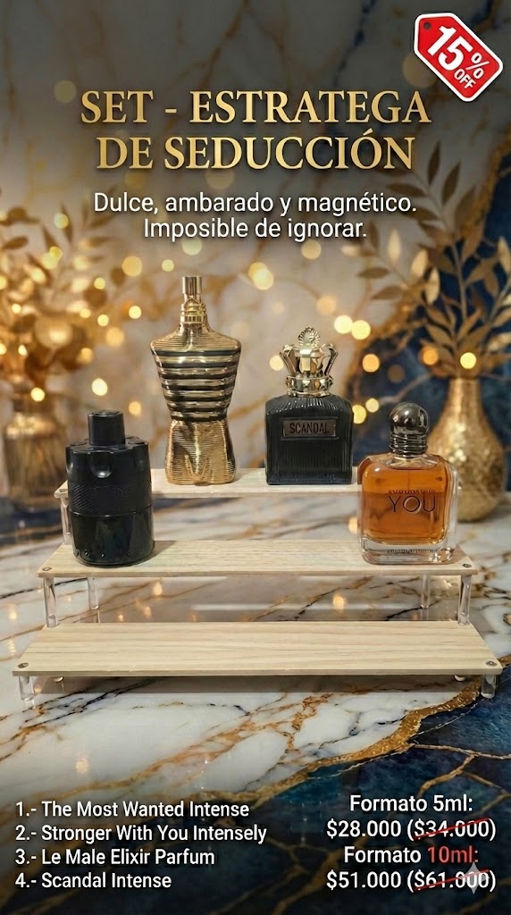 Descubre el poder de la atracción con el Set Estratega de Seducción. Una selección audaz de los cuatro perfumes más elogiados y magnéticos del momento: The Most Wanted Intense, Stronger With You Intensely, Le Male Elixir y Scandal Intense. Ideal para la noche, citas y momentos donde quieres dejar huella. Llévate este cuarteto ganador con un 15% de descuento.